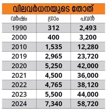 കഴിഞ്ഞ 50 വർഷത്തെ വിലനിലവാരം പരിശോധിച്ചാല് 14600 ശതമാനത്തോളമാണ് സ്വർണവിലയിലുണ്ടായ വർധനവ്. 1975ല് ഗ്രാമിന് 50 രൂപയും പവന് 400 രൂപയുമായിരുന്നു.